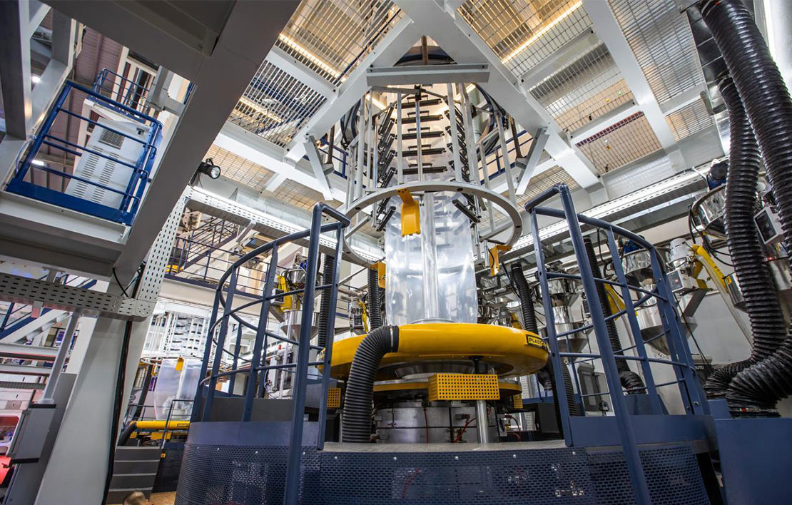 七層非對(duì)稱阻隔膜吹膜機(jī)通常配備 :“高速共擠系統(tǒng)”(7 臺(tái)精密螺桿)、“內(nèi)冷系統(tǒng)+上旋裝置”、“自動(dòng)風(fēng)環(huán)系統(tǒng)”裝置。智能化冷卻裝置不僅能夠大大提升冷卻效率,提高產(chǎn)量;還能更好控制薄膜寬度和厚度,提升產(chǎn)品質(zhì)量。